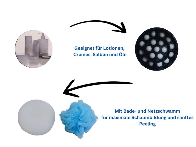 Das Lotion-Creamer Set in blau ist die ideale Lösung für komfortables Eincremen und Körperpflege – perfekt für schwer erreichbare Körperstellen und für Personen mit eingeschränkter Beweglichkeit. Das Set enthält 3 Aufsätze: einen Lotion-Creamer, einen Badeschwamm und einen Netzschwamm, die vielseitig für Lotionen, Cremes, Salben und Öle eingesetzt werden können.