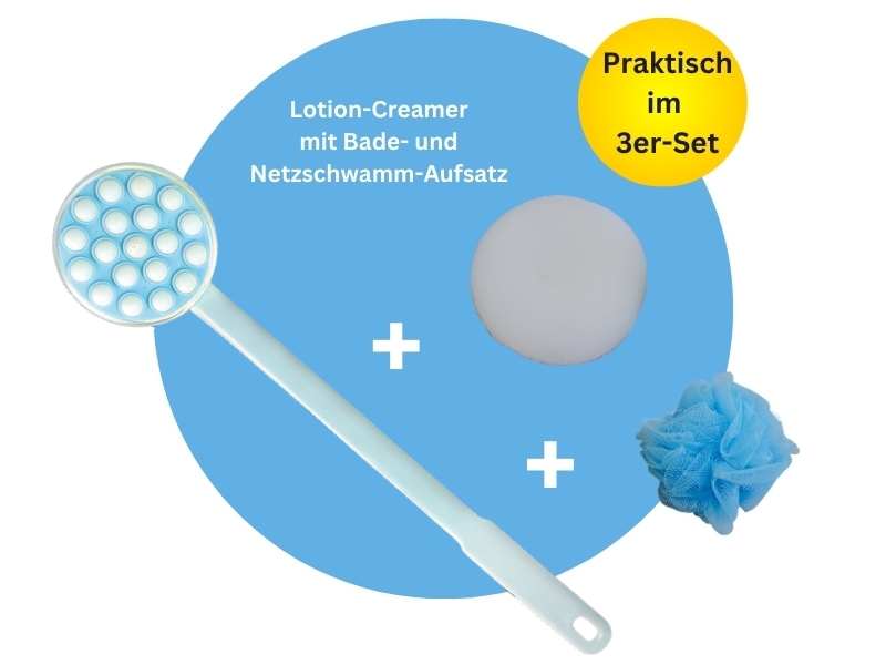 Das Lotion-Creamer Set in weiß-mint ist die ideale Lösung für komfortables Eincremen und Körperpflege – perfekt für schwer erreichbare Körperstellen und für Personen mit eingeschränkter Beweglichkeit. Das Set enthält 3 Aufsätze: einen Lotion-Creamer, einen Badeschwamm und einen Netzschwamm, die vielseitig für Lotionen, Cremes, Salben und Öle eingesetzt werden können.