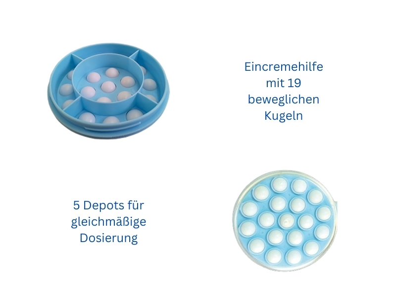 Der Lotion-Creamer in weiß-mint ist eine praktische und komfortable Eincremehilfe, die das Auftragen von Lotionen, Cremes, Salben und Ölen deutlich erleichtert – ideal für Personen mit eingeschränkter Beweglichkeit oder für schwer erreichbare Körperstellen. Die 19 beweglichen Massagekugeln verteilen Pflegeprodukte gleichmäßig auf der Haut und sorgen gleichzeitig für eine angenehme Massagewirkung.