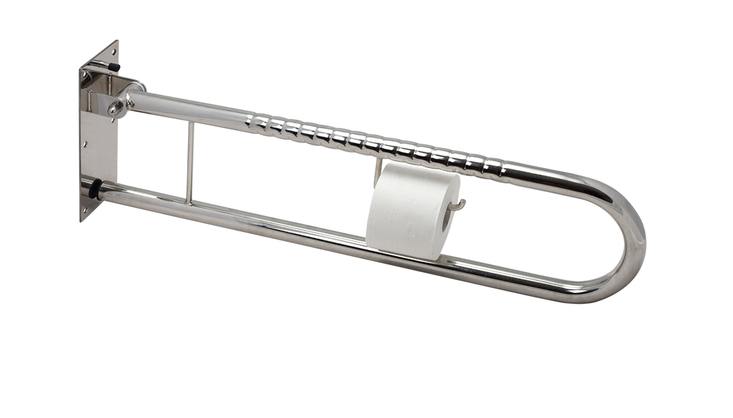 Die strukturierte Oberflächenprägung bietet eine rutschsichere Grifffläche, während die hochglanzpolierte Edelstahloberfläche nicht nur modern wirkt, sondern auch korrosionsbeständig, pflegeleicht und leicht zu desinfizieren ist. Bei Nichtgebrauch kann der Stützgriff einfach nach oben geklappt werden, wodurch er äußerst platzsparend ist.