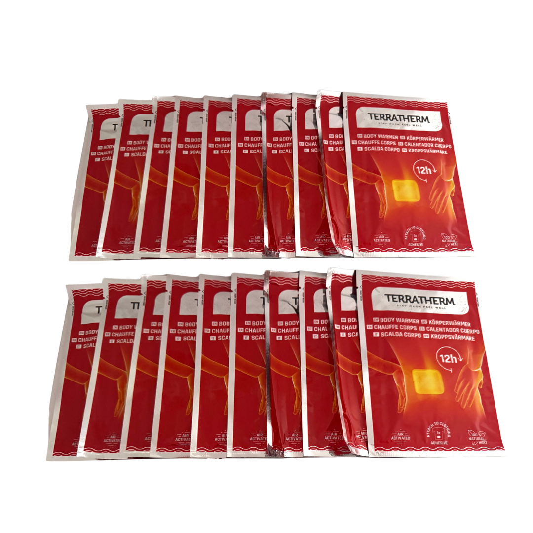 TerraTherm Körperwärmer 20 STÜCK – selbstklebende Wärmepads mit Naturstoffen 12h Bodywarmer