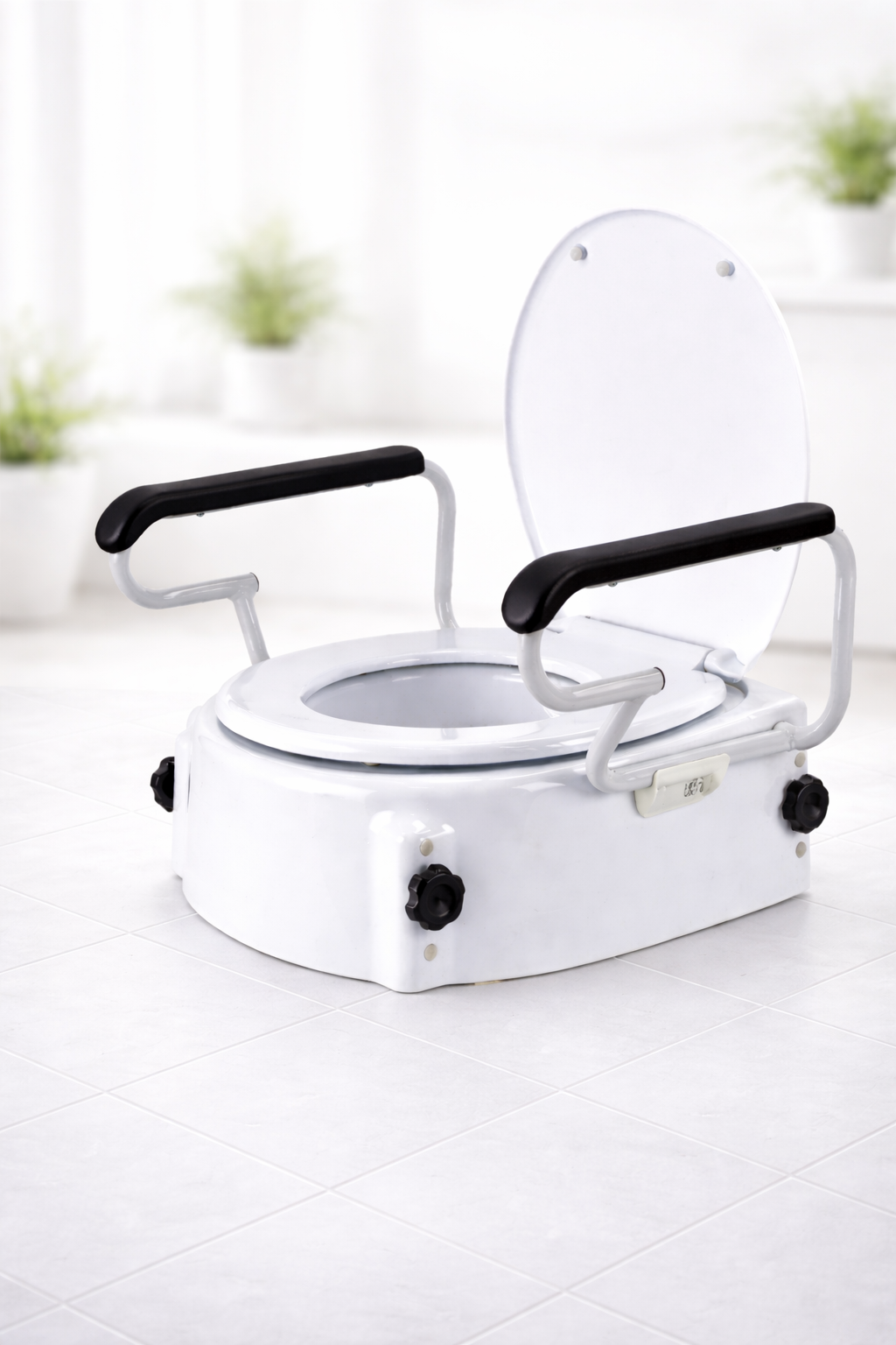 Die stabile Konstruktion aus Aluminium und TPR vereint Robustheit mit geringem Gewicht. Besonders praktisch: Die gepolsterten Armlehnen sind hochklappbar und die Sitzerhöhung kann mit oder ohne Armlehnen eingesetzt werden – ganz nach individuellem Bedarf.